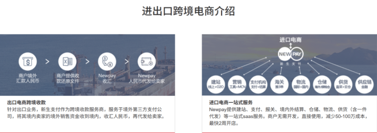 整体方案:NewPay提供“商城系统+ERP系统+支付结算+报关+硬件设备+供应链”一站式跨境电商服务。