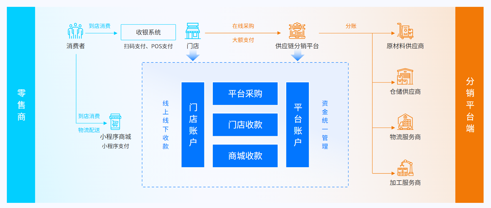 提供全通道支付交易体系,一站式支付接入,打通产业链上下游资金流与信息流
