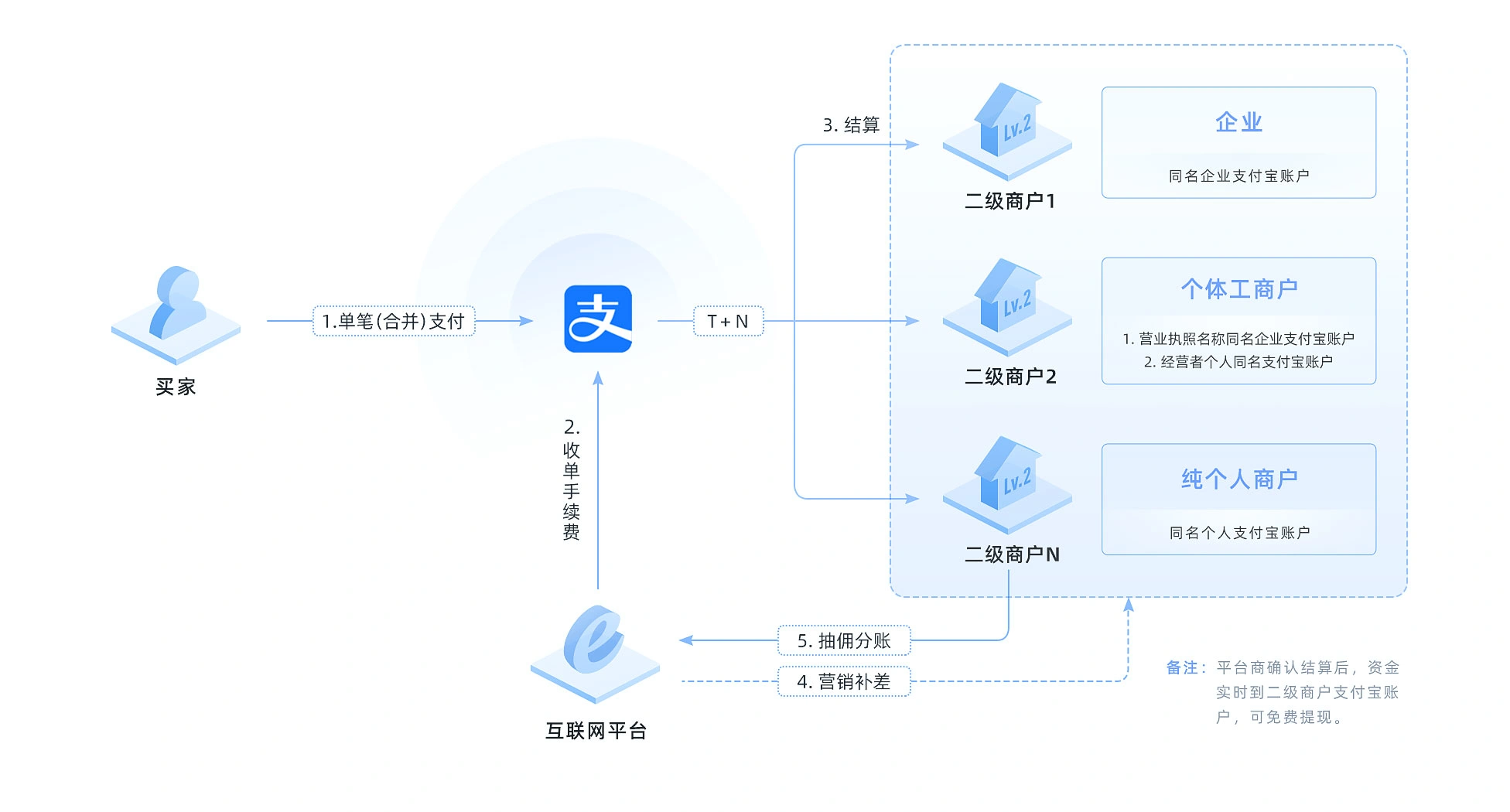 产品简介互联网平台直付通产品是支付宝面向电商、数娱等互联网平台(以下简称平台)专属打造的集支付、结算、分账等功能为一体的资金解决方案。该方案致力于帮助平台通过合规的资金清算模式,完成平台上各商家的交易资金处理。平台上的二级商户入驻支付宝成为支付宝的商家,买家在该平台的订单支付成功(支持多个商家的订单合并支付)后,支付宝记录对应商家待结算资金,待平台确认可结算时,支付宝将资金直接结算至商家指定的收款账号。同时支持平台按订单灵活抽取佣金。