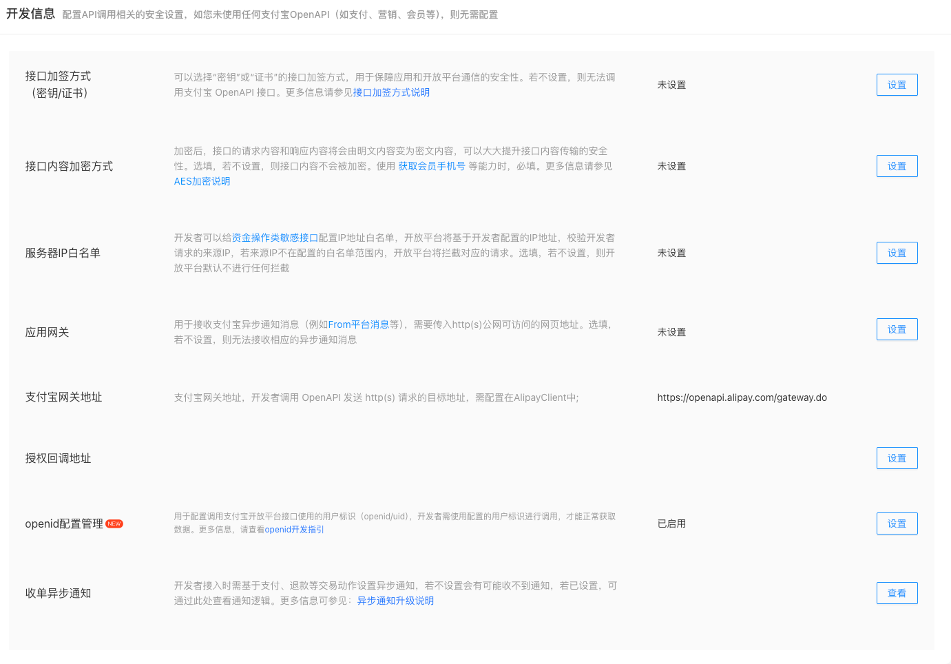 选填。用于提高应用访问开放平台的安全性,避免因应用私钥泄漏等原因导致业务受损,保障用户资金安全,可查看 服务器 IP 白名单。