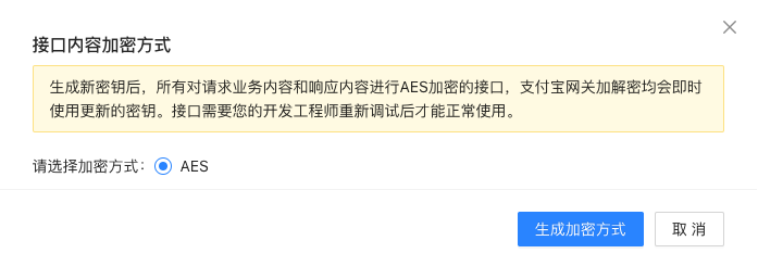 选填。用于加 / 解密 OpenAPI bizContent 报文内容,可大幅提升接口内容传输的安全性。可查看 接口内容加密方式。