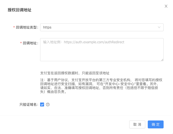 说明:授权链接中配置的 redirect_uri 的值必须与此回调地址保持一致 (如:https://www.alipay.com) 。