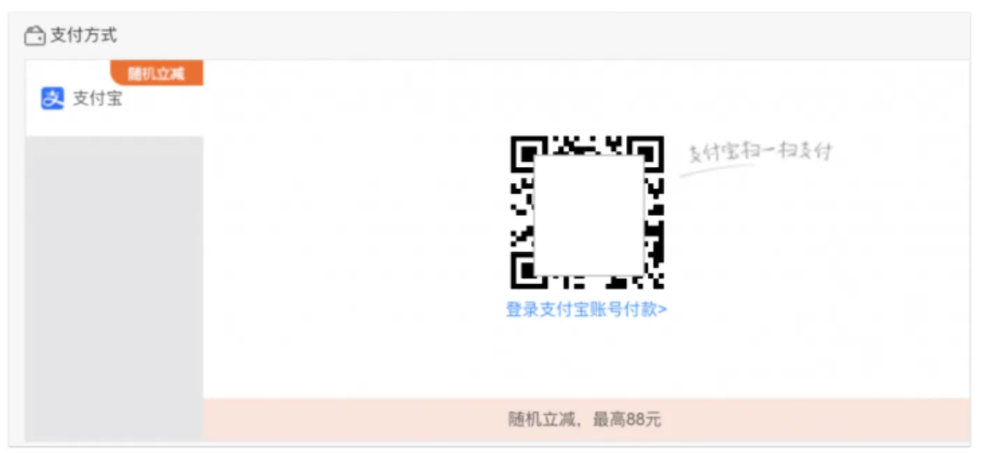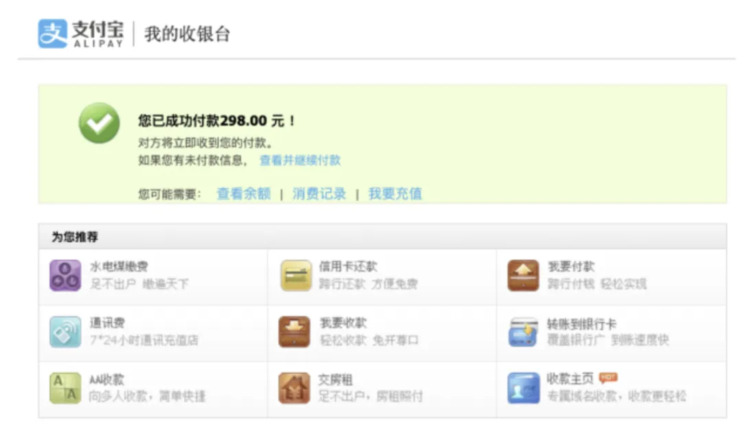 1.在商家的网站选择使用支付宝支付,对用户展示商家的支付宝收款二维码: | 2.用户扫码进行付款,支付成功。 |