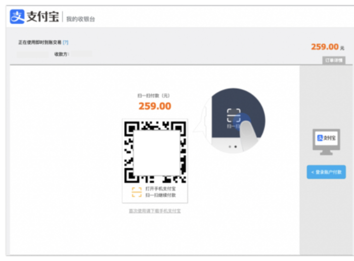 收款账户:默认收款到商家签约账号的支付宝余额账户,实时到账。