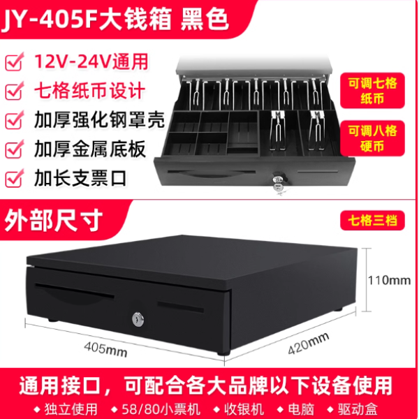JY-405 收银钱箱(JY-405F 大钱箱)产品定位:面向各类线下商户的安全耐用型收银存储设备,以 “多场景适配、安全防盗、便捷管理” 为核心,为现金交易提供可靠的存储与管理解决方案。产品概述JY-405 收银钱箱是一款专为现金收银场景设计的耐用型存储设备,采用加厚强化钢罩壳与金属底板打造,外部尺寸 420mm×405mm×110mm,支持 12V-24V 通用电压。设备采用七格纸币 + 八格